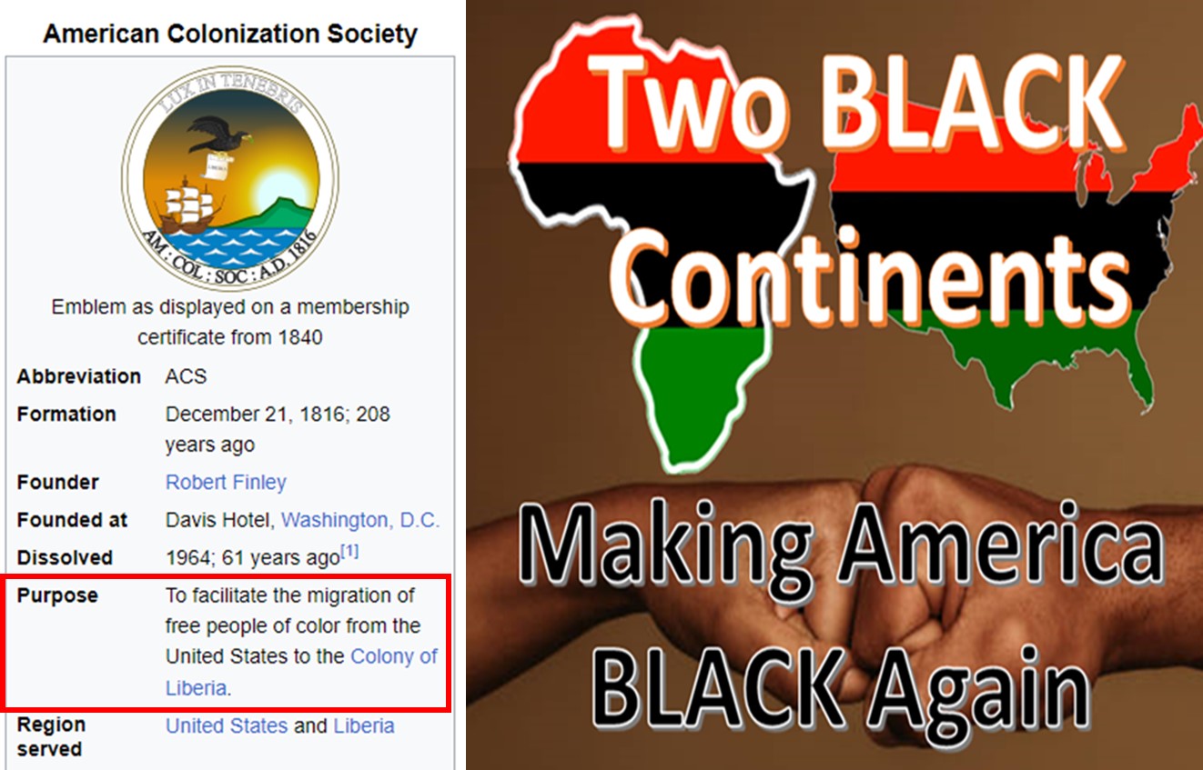 American Colonization Society / Society for the Colonization of Free People of Color of America: An American organization founded in 1816 by Robert Finley to encourage and support the repatriation of freeborn people of color [i.e. SUPPORTING the presence of BLACK Indians PRIOR to the Europeans’ so-called DISCOVERY of America] and emancipated slaves to the continent of Africa [SUPPORTING Europe’s KNOWLEDGE of TWO (2) BLACK Continents].
