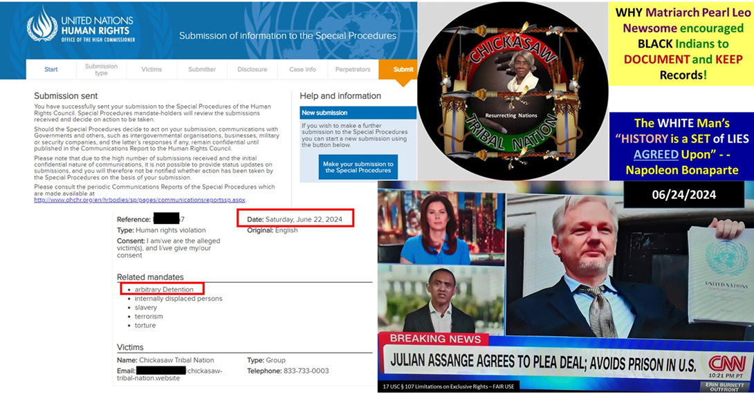 IMPORTANT TO NOTE: Julian Assange being the FIRST of several Political Prisoners being requested to be released IMMEDIATELY – i.e. in that United States of America’s Officials were insisting on having him EXTRADITED to the USA over the Chickasaw Tribal Nation’s/Utica International Embassy’s Officials’ OBJECTIONS! Therefore, remaining ACTIVE behind-the-scenes and focusing on getting OFFICIAL Complaint/EMERGENCY Petitions . . . submitted and AVOIDING the USA’s DISTRACTIONS… TACTICS, the CTN Officials being able to accomplish what previous “BLACK Indian” HUMAN RIGHTS/Civil Rights Activists (as Martin Luther King, Jr. and Malcolm X) were unable to accomplish because of the CONSPIRACIES of the USA’s NAZI/WHITE Supremacist/Ku Klux Klan . . . Officials to have them ASSASSINATED!