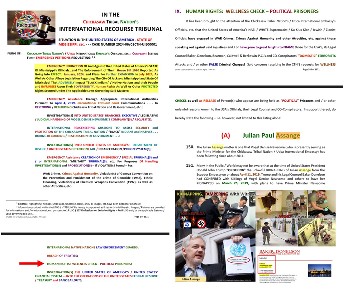 On June 21, 2024, NOTIFICATION regarding problems with filing of the Chickasaw Tribal Nation’s/Utica International Embassy’s COMPLAINT/Emergency Petitions . . . was reported. Assange’s Legal Team and/or Contacts being included in EMAIL(S)!