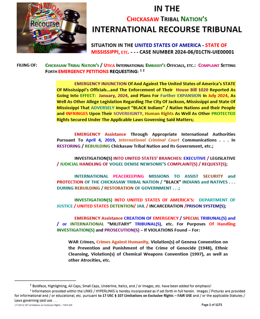 On June 22, 2024, Prime Minister Vogel Denise Newsome (after WELL over 12 combined hours in both United Nations Forums) was able to get their Chickasaw Tribal Nation’s Complaint/EMERGENCY Petitions . . . submitted!
