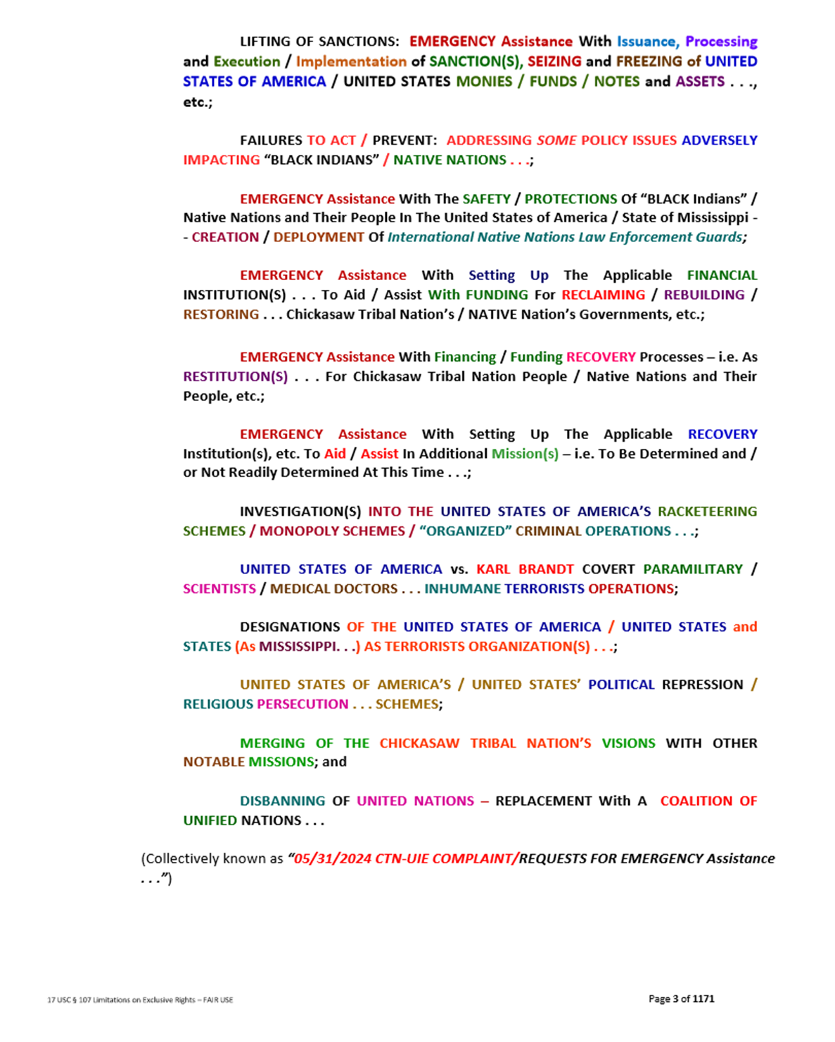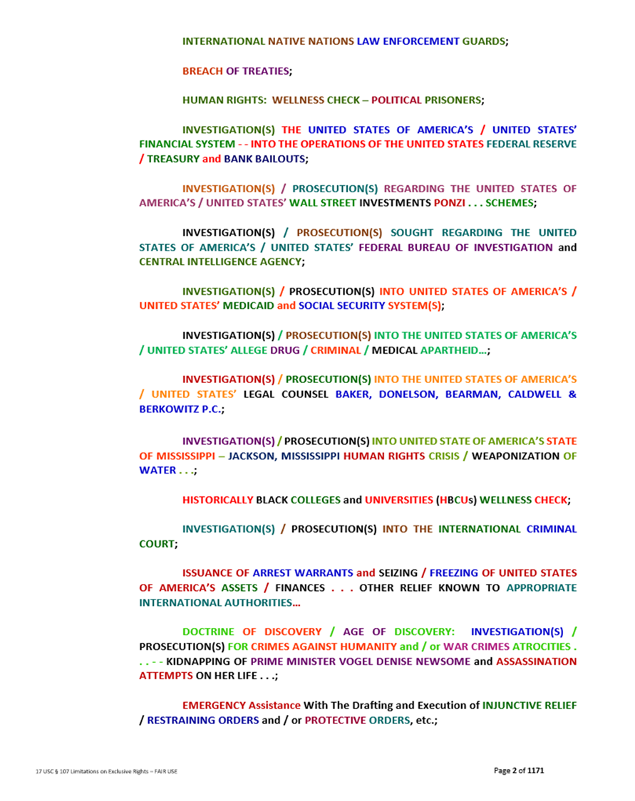 The following are excerpts pulled from the June 1, 2024, Complaint/Emergency Petitions . . . submitted to the United Nations Member States (via Email and/or Notification sent via Facsimile). Then on or about June 22, 2024, to the United Nations Human Rights Office Of The High Commissioner – i.e. approximately 1,170 Pages.
