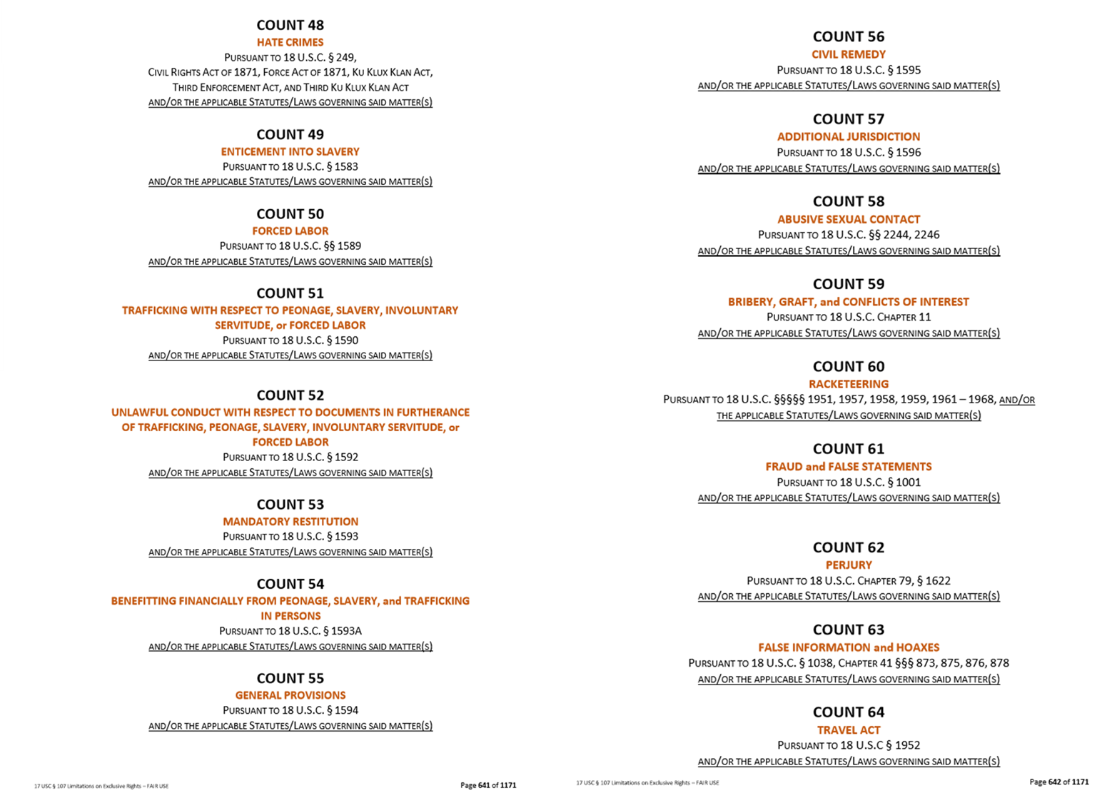 The following are approximately 65 Counts addressing the Criminal Charges being sought against the United States President Donald John Trump, his Legal Counsel Baker Donelson and Others that have been listed in the Complaint/Emergency Petitions. . . submitted to the United Nations Human Rights Office Of The High Commissioner as well as some of the Members of the General Assembly – i.e. which include WAR Crimes, Crimes Against Humanity and other Atrocities, etc.!